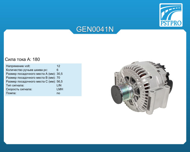 ХарактеристикиVolt: 12 A: 180 Размер посадочного места A (мм): 30,5 Размер посадочного места B (мм): 70 Размер посадочного места C (мм): 56,5 Количество ручьев шкива pc: 6 Тип сигнала: LIN Скорость сигнала: LMH