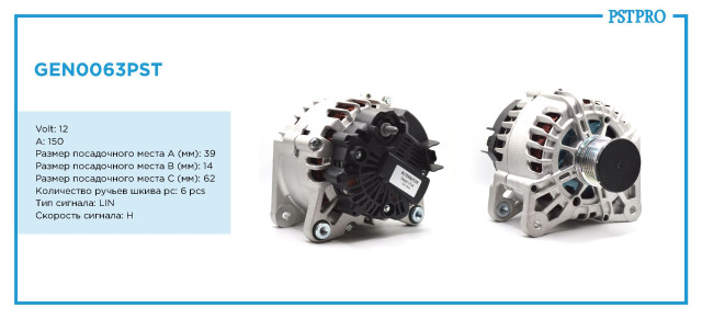 ХарактеристикиVolt: 12 A: 150 Размер посадочного места A (мм): 39 Размер посадочного места B (мм): 14 Размер посадочного места C (мм): 62 Количество ручьев шкива pc: 6 pcs Тип сигнала: LIN Скорость сигнала: H