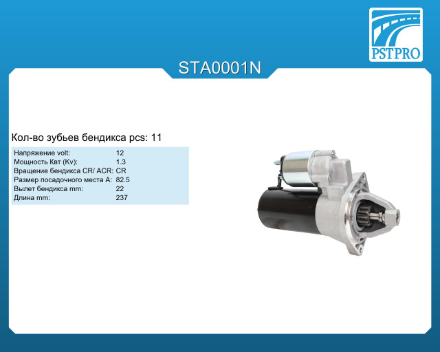 ХарактеристикиVolt: 12 Kv: 1,3 pcs: 11 Вращение: по часовой (CR) A: 82,5 Вылет бендикса: 22 Длина: 237