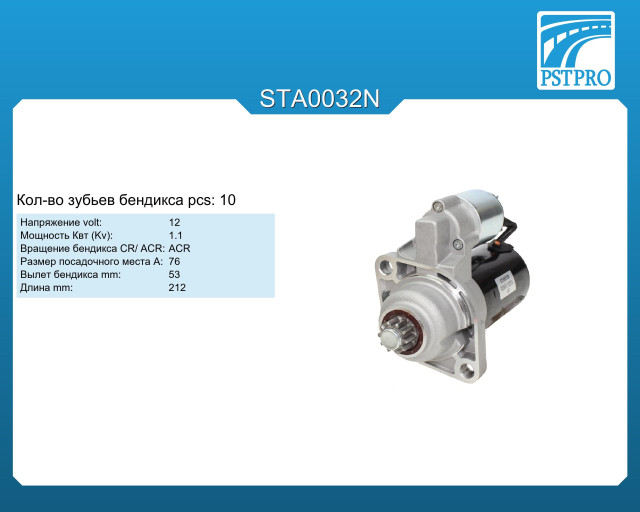 ХарактеристикиVolt: 12 Kv: 1,1 pcs: 10 Вращение: Против часовой (ACR) A: 76 Вылет бендикса: 53 Длина: 212